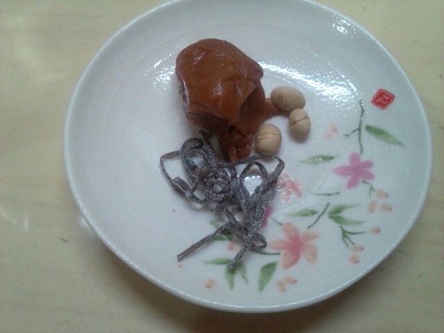 ・八角湯飲みに福豆3粒・塩昆布適量・梅干1個を入れます