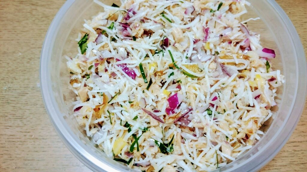 ツナ缶の汁をよく切り、ボウルにあけ、ココナッツロングを加えます。