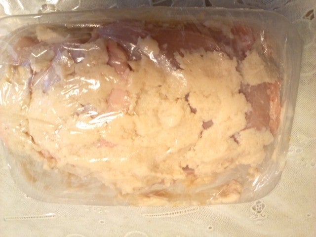 鶏むね肉を漬けて薄くそぎ切りにして焼くと、